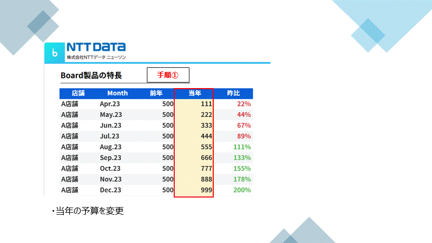 Boardは独自の多次元データベース(DB)を保持しており、この多次元DBは他のBIとは異なりレポート上から直接数値を更新しダッシュボード上で情報を確認しつつ、データをリアルタイムで更新することが出来ます。