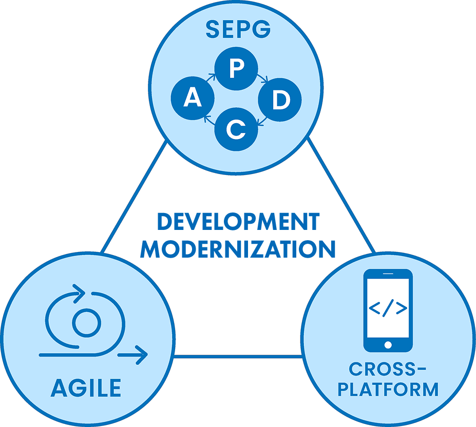 開発モダナイズは、「アジャイル」「プロセス」「クロスプラットフォーム」を核に、変化に強く、価値を生み続ける開発文化を築きます。